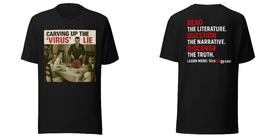 Per celebrare questa crescente consapevolezza della frode in virologia, ho creato una maglietta che riflette questo impegno, pensata per diffondere il messaggio in modo festoso. Chiunque fosse interessato può acquistarla presso il negozio ViroLIEgy .